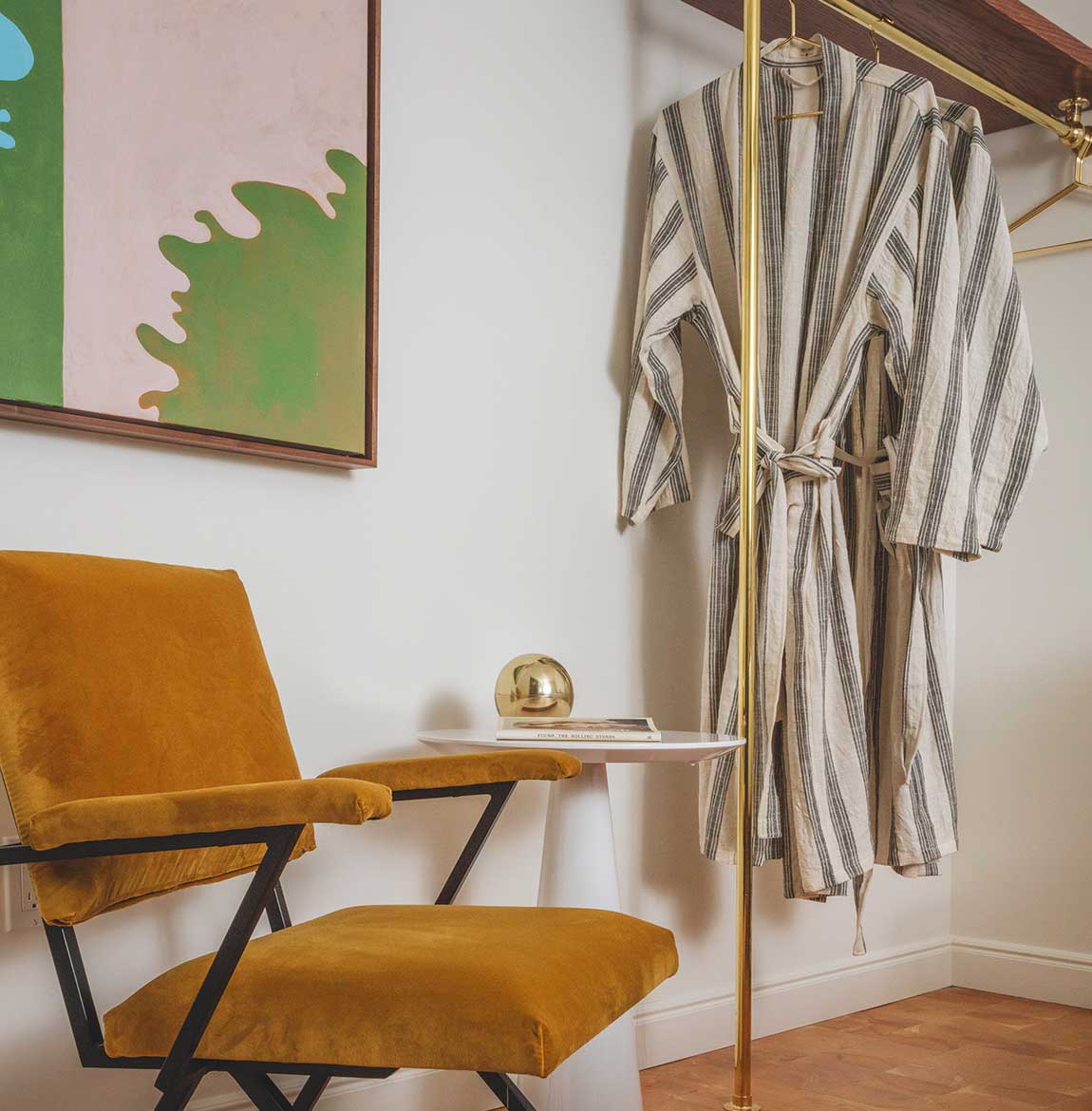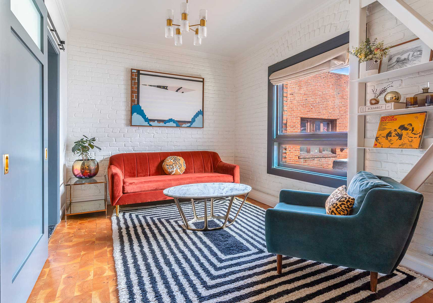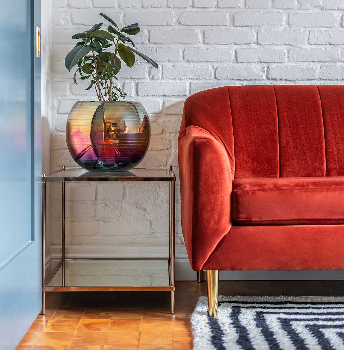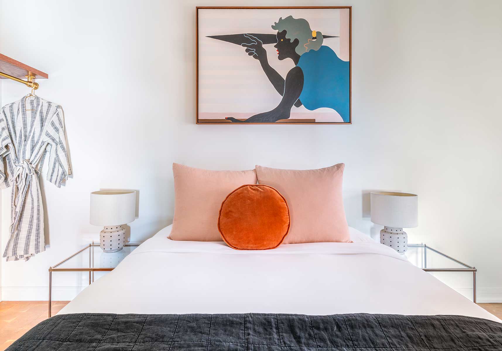 A corner suite with a sunlit living room and bedroom, all designed for work, play and anything in between. Relax on the red velvet sofa or queen bed with cocktails from our bar – or finish the next chapter of your novel at the wooden desk.