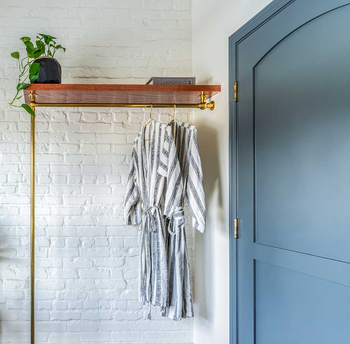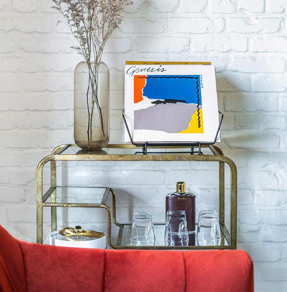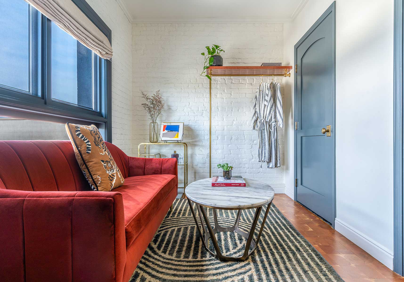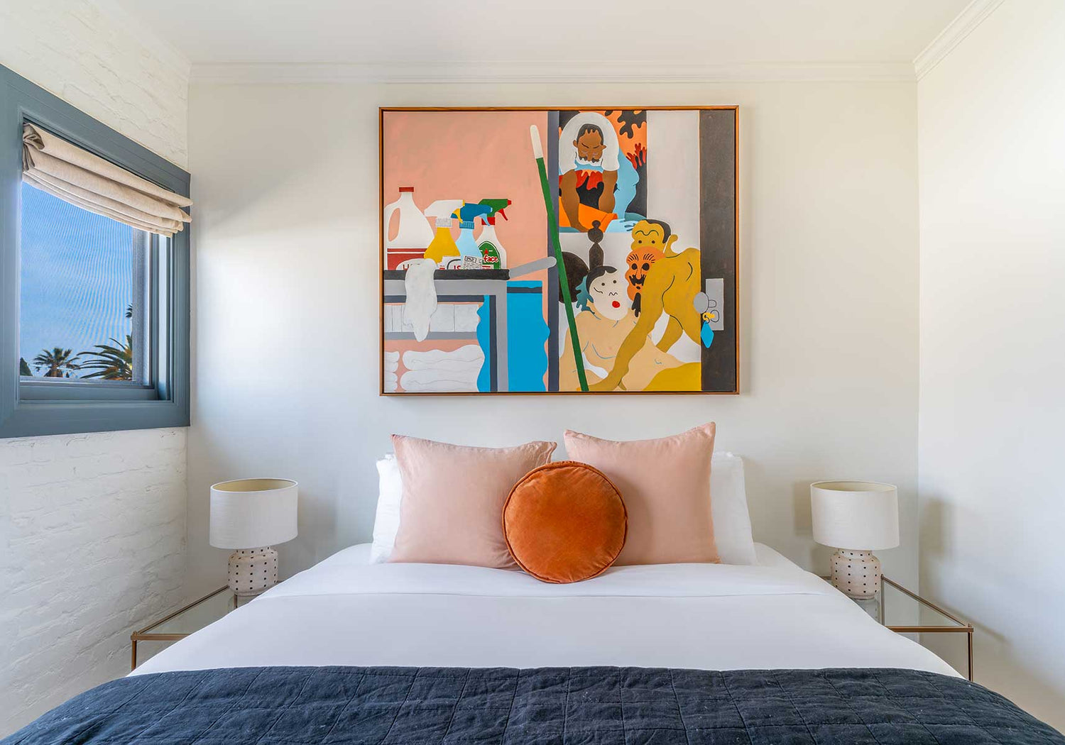 A corner suite with an awe-inspiring view of the Hollywood Hills, Griffith Observatory and Hollywood sign. Play records in the living room among new and vintage treasures: a red velvet sofa, vintage glass bar cart, vintage rug and wooden desk. After catching music down at our bar, head straight for your bedroom where a king bed and vintage needlepoint stool await you.