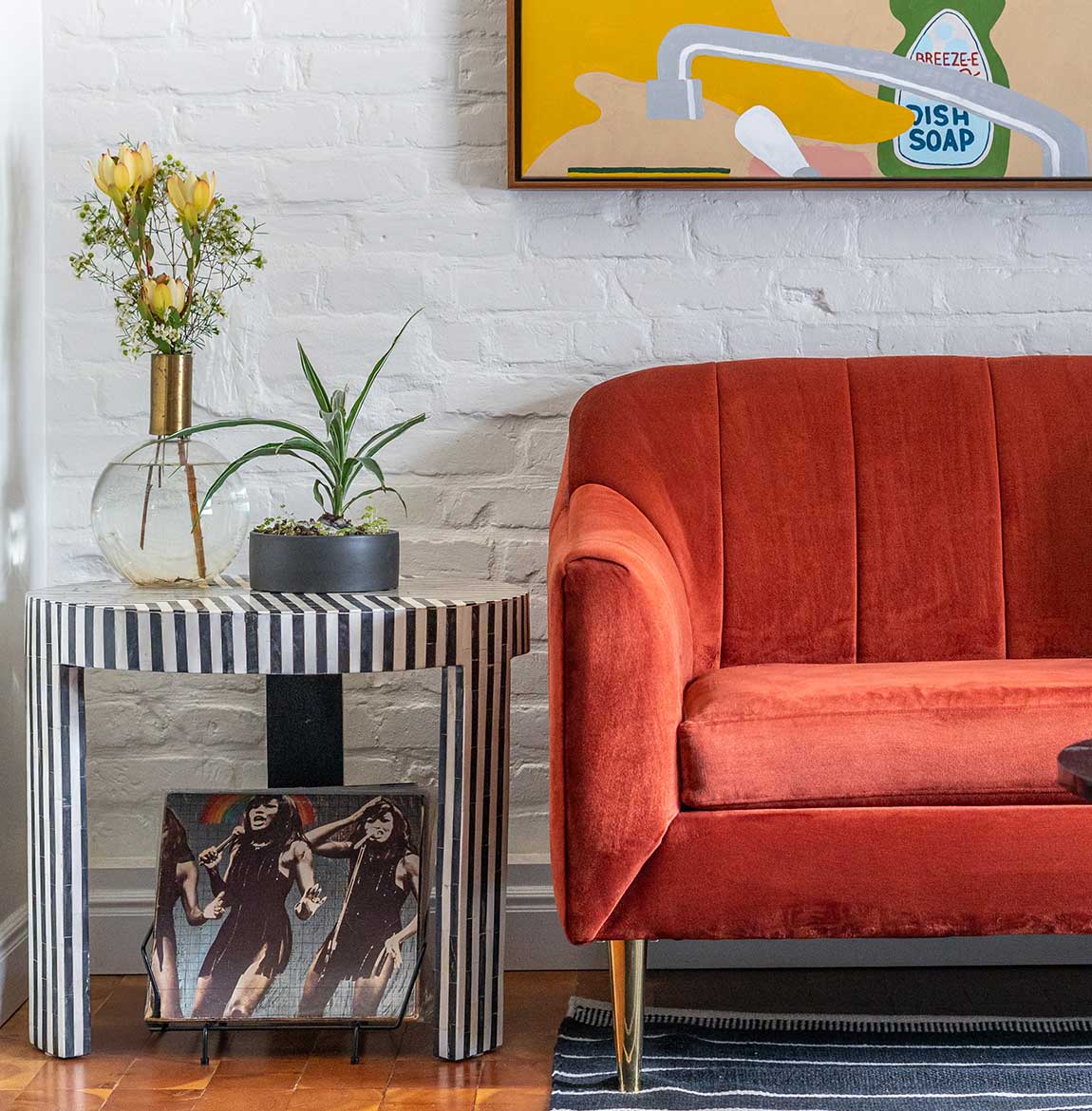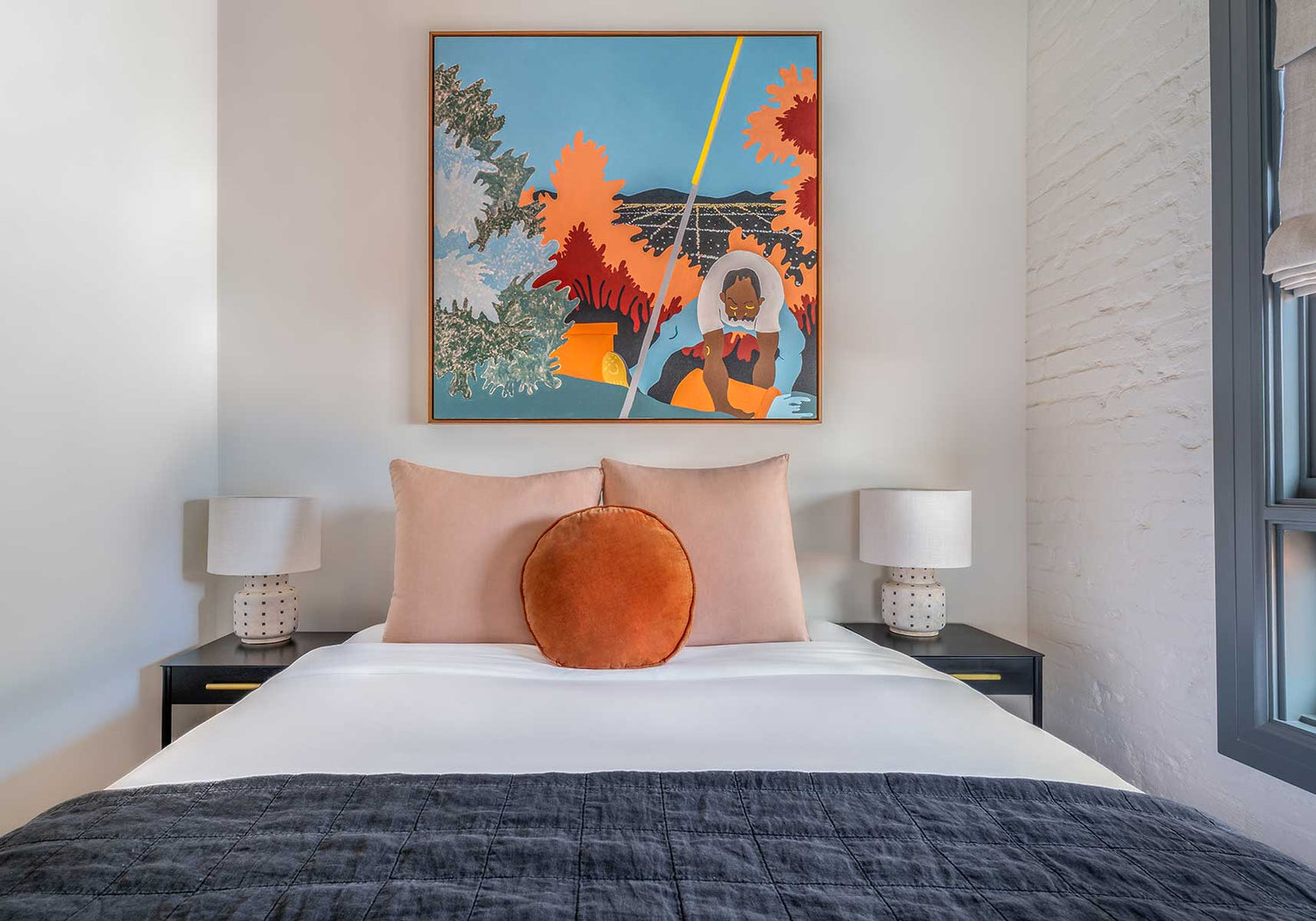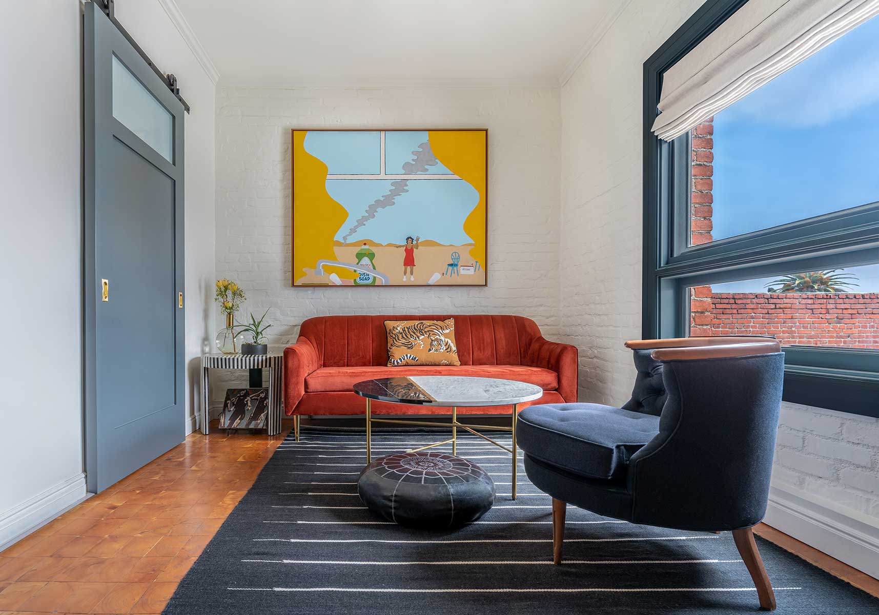 A corner suite where the bustle of East Hollywood feels worlds away. Take it easy in our sunlit living room with a red velvet sofa, blue chair and a wooden desk where you can pen lyrics for another song. Or retreat to the bedroom where a queen bed and reading nook await cocktails from our downstairs bar.